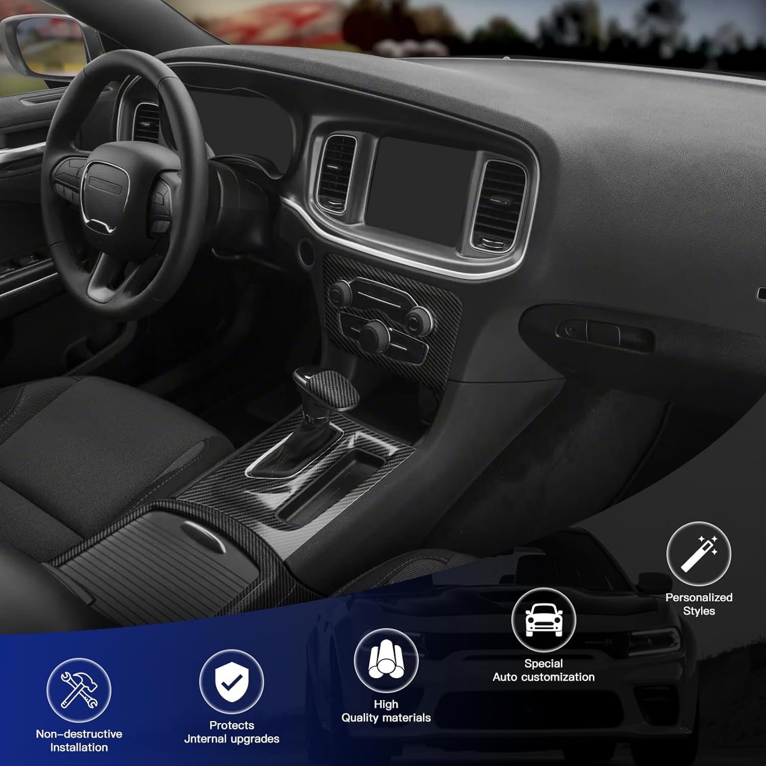 Fancemot 5PCS Carbon Fiber Interior Cover Kit Compatible with 2015-2023 Dodge Charger, Gear Shift Panel Cover Cup Holder Cover AC Air Vent Cover Headlight Switch Panel Cover