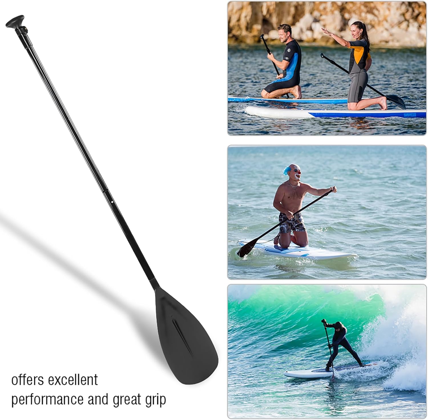[EXCELLENT PERFORMANCE] Adjustable 2‑part stand up paddle board paddle offers excellent grip and performance with adjustable height and shaped handle.[PORTABLE DESIGN] Break apart paddle for easy travel and storage, making it great for on-the-go adventures.[ENHANCED STROKE] Angled blade shape provides better and longer strokes compared to regular kayak paddles, improving efficiency on the water.[VERSATILE USE] Aluminum shaft makes this paddle suitable for all types of stand up paddle boards, whether regular or inflatable.[2-IN-1 SOLUTION] No need to carry two paddles, enjoy the convenience of having 2‑paddles‑in‑1 with this versatile paddle.Spec:Features:Adjustable 2-part stand up paddle board paddle offers excellent performance and great grip with adjustable height and shaped handle. This paddle is a 2 piece, break apart the paddle making it great for travel and portable storage. Angled shape and size of the blade provides much better and longer stroke than regular kayak paddle. Aluminum shaft makes these paddles perfectly suited for any type of regular or inflatable stand up paddle board. Now there is no need to carry 2 paddles, you can have 2-paddles-in-1!Specification:Condition: 100% Brand NewColor: blackMaterial: aluminum alloy + PPMaximum length: Approx. 215cm / 84.6inMinimum length: Approx. 163cm / 64.2inBlade dimension: 40*20cm / 15.7*7.9inWeight: Approx. 1.12kgPackage List:1 * Set of paddle (other items are not included)Note: