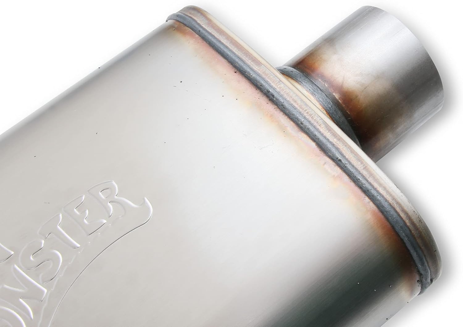 Unleash your Monster with Flowmonster 409 Stainless Steel performance mufflers! The Flowmonster series of absorption style mufflers deliver a moderate tone for the enthusiast looking for a deeper, more aggressive exhaust note than most OE (Original Equipment) mufflers, unlike the racey exhaust note associated with "chambered" style mufflers. Interior construction features 3.50 inch "straight-through" perforated 409 stainless steel tube surrounded by high-temperature sound absorption packing material which helps to deliver a deeper, mellower exhaust note. The internal design is reversible allowing the flexability to be installed in either direction to best accommodate fitment with the intended vehicle. The fully MIG-welded 409 Stainless Steel material is embossed with the "FlowMonster" logo on the case.