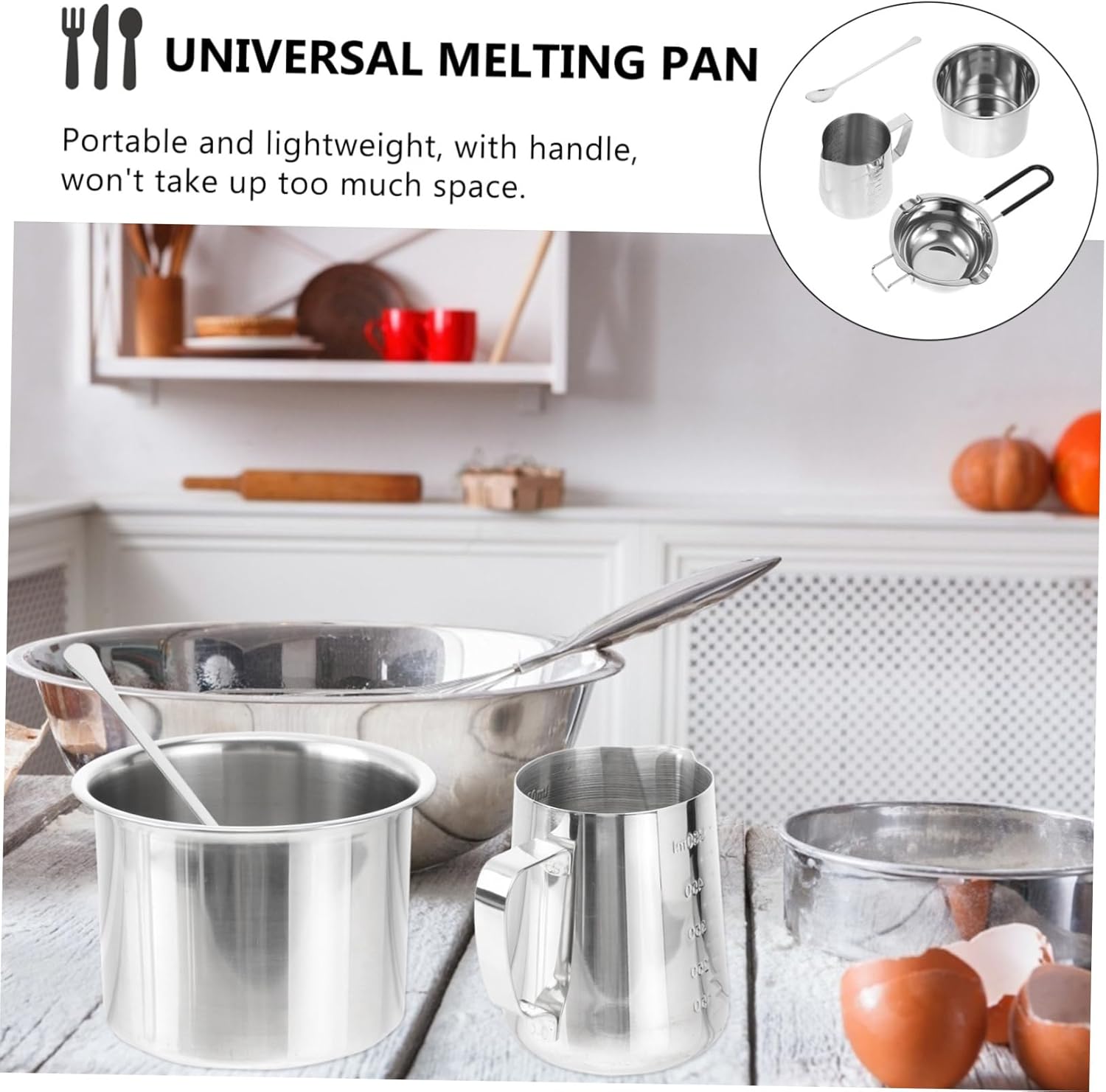 Package List 1 x melting pot 1 x boiling water pot 1 x measuring cup 1 x mixing spoon Characteristics - Material: Stainless steel melting holder. - Size: About 26.50X14.00X7.00cm/10.41X5.50X2.75inch long handle melting pot. - Color: Silver melting storage pot. - The stainless steel melting pot and will not easily , comes with long handle soap melting pan. - The melting pot is made of premium stainless steel material, which is more durable and sturdy chocolate melting pot. - Perfect to melt chocolate, candy, cheese, butter, caramel, wax, soap, candle and so on melting pan. - The handle design allows you to move it conveniently and safely, and it can be hung up when not in use melting container. - Our chocolate melting pot with a long silicone sleeve handles to prevent burns while boiling liquids stainless steel melting pot.Goods Informationmelting storage pot Useful kitchen cooking tool that can be used for cooking noodles or.melting bowl The multi-functional melting pot is made from material with non-stick function, and it is easy to clean.soap melting pan It can be placed directly on the grill to heat the product with easy and convenient handle design