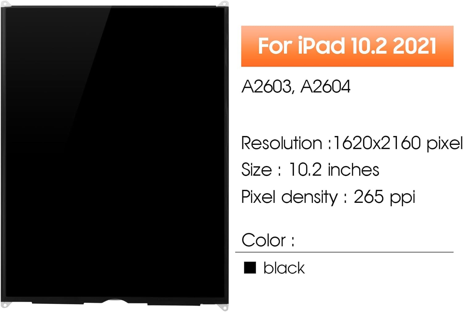 -Compatible With: For iPad 10.2 2021/9th Generation Screen Replacement (No Touch Function)-Model Number:A2602,A2603,A2604,A2605 -Size: 10.2 inches-Resolution:1620 x 2160 pixels【Please Note】▶ Correct installation requires special skills and techniques, you can go to the YouTube site to view the video to learn the installation method before trying▶ It is highly recommended to find a professional to perform the replacement. We may not be responsible for any damage caused during the replacement process▶ Unplug the battery connector and remove the battery before installation to avoid short circuit.▶ Before installing the LCD, remove all the old glue in case it affects the new glue paste.▶ If your case is in an unnatural state such as bent, please replace the case before replacing the LCD. Otherwise, the screen glass is likely to breakBefore confirming your purchase, please verify the model number of your own device, and the correct shipping address. If you find any problems after receiving screen, after learning the specific situation, we will immediately solve the problem for you and provide suitable and effective solutions.