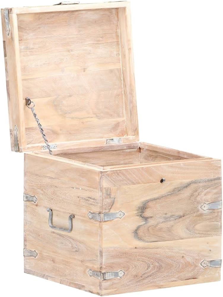 The wooden chest adds a simplistic look to your home decor and provides ample storage space for your items.The chest is made of solid acacia wood, making it stable and durable. It has a latch on the front and two handles on the side for lifting the chest. This storage box, with a stable flat top, can also be used as a bedside table. The craftsmanship and the beautiful wood grains make every piece of furniture unique and slightly different from the next.Important note: Colours and grains may vary from piece to piece, making each piece unique; the delivery is random.Material: Solid acacia wood with white finish, ironDimensions: 15.7" x 15.7" x 15.7" (W x D x H)LockableAssembly required: No