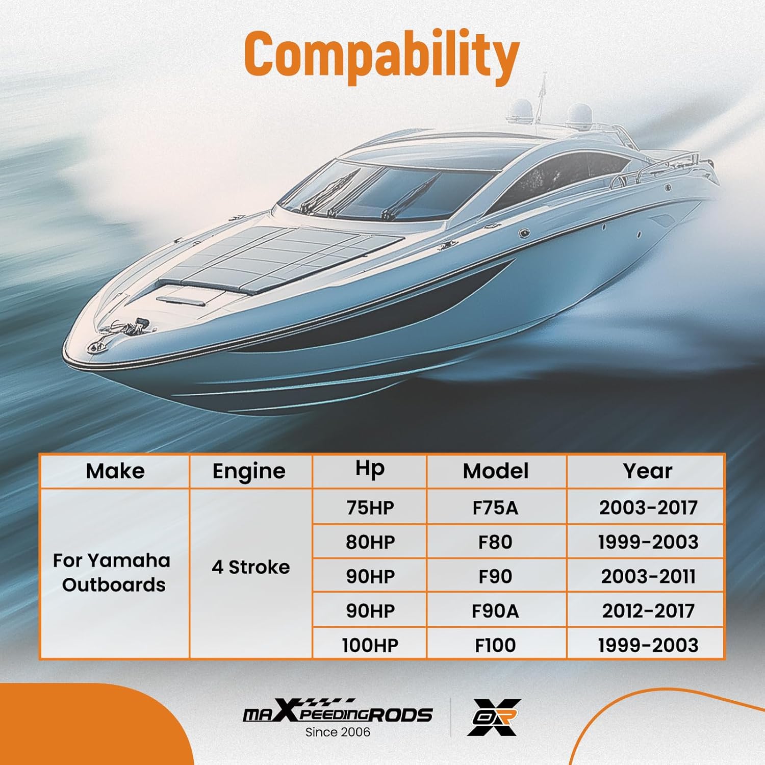 • 【Application】This water pump impeller repair kit fits for the Following 75HP Yamaha 4 Stroke Outboards:F75A, 2003-2017, for the Following 80HP Yamaha 4 Stroke Outboards:F80, 1999-2003. for the Following 90HP Yamaha 4 Stroke Outboards:F90 2003-2011 , F90A 2012-2017, for the Following 100HP Yamaha 4 Stroke Outboards:F100 1999-2003
