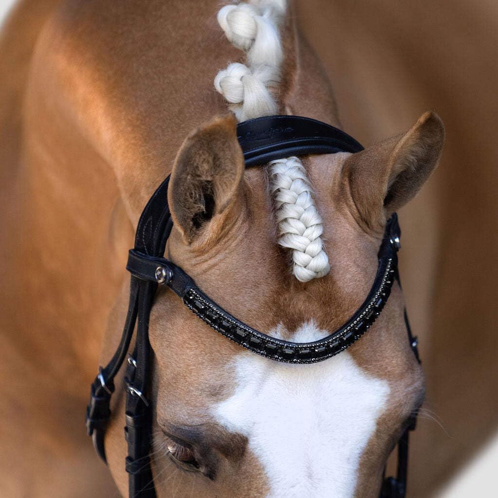 This chic black crystal browband features a centre row of square cut crystals, encased by two rows of smaller stones. A modern style, it adds class to any bridle.This browband features super supple black Italian leather, handcrafted from Austrian stellux crystals.Available in cob, full and warmblood.