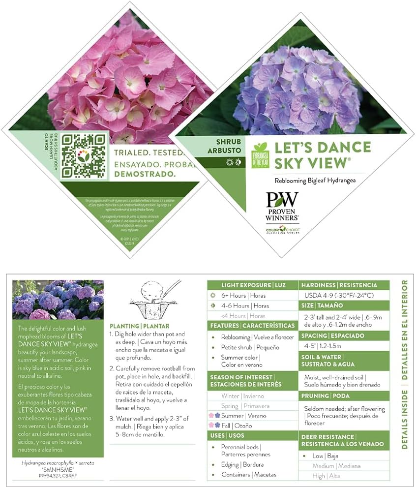 Let’s Dance Sky View big leaf hydrangea is a standout for consistent, yearly blooming, whether you grow it in Michigan or Florida. This compact hydrangea has the ability to not only conserve its old wood buds in the face of weather challenges, but also its ability to continue creating new flowers. You’ll also love how easy this cultivar is to turn blue, which is what we recommend, since it’s so spectacular this way! Flowers emerge a beautiful sky blue with a honeydew-green eye before maturing to a full sky blue. Its nice compact growing habit makes it both a good container and garden plant.
