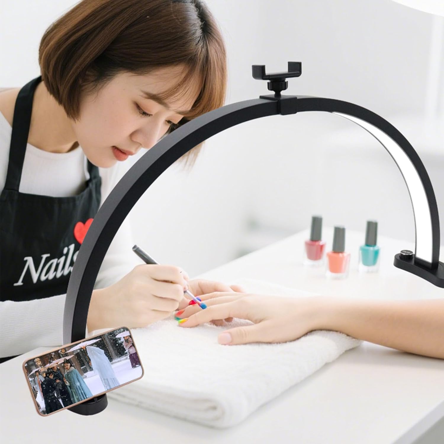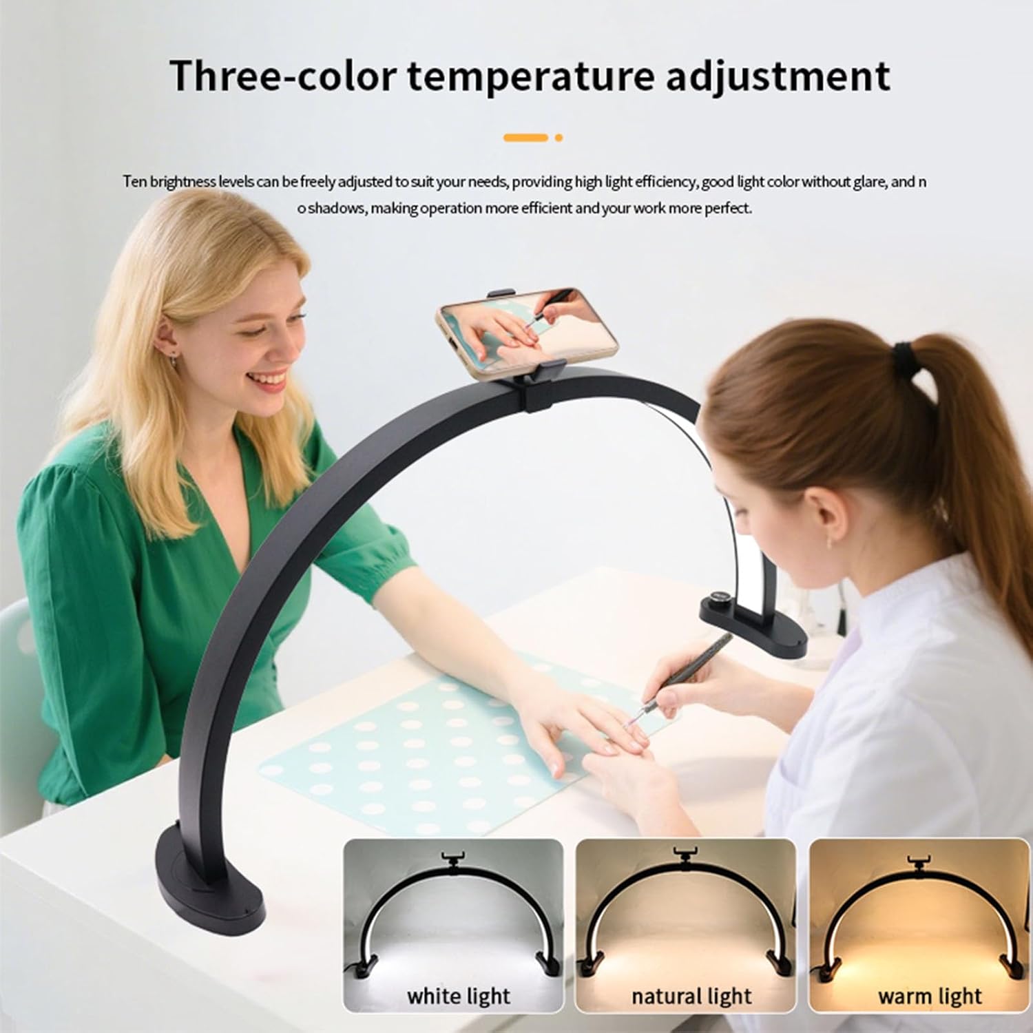 Spec: Item Type: Desk Half Moon Light Material: Aluminum, ABS, PC Weight: Approx. 1245g / 43.9oz Power: 40W LED Count: 280 PCS Color Temperature Range: 3200K-5600K Color Rendering Index: RA>90 Package List: 1 x Lamp Head 1 x Supply Adapter 2 x Desktop Curved Stand 2 x Phone Holder Accessory 1 x User Manual How To Use: Connect the power supply and switch on for use.