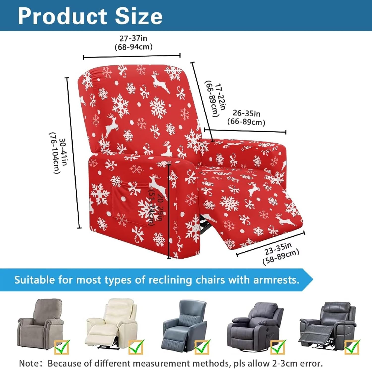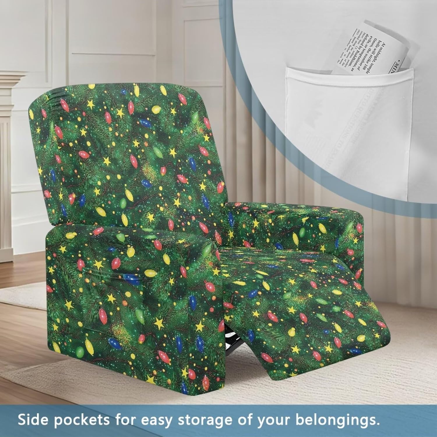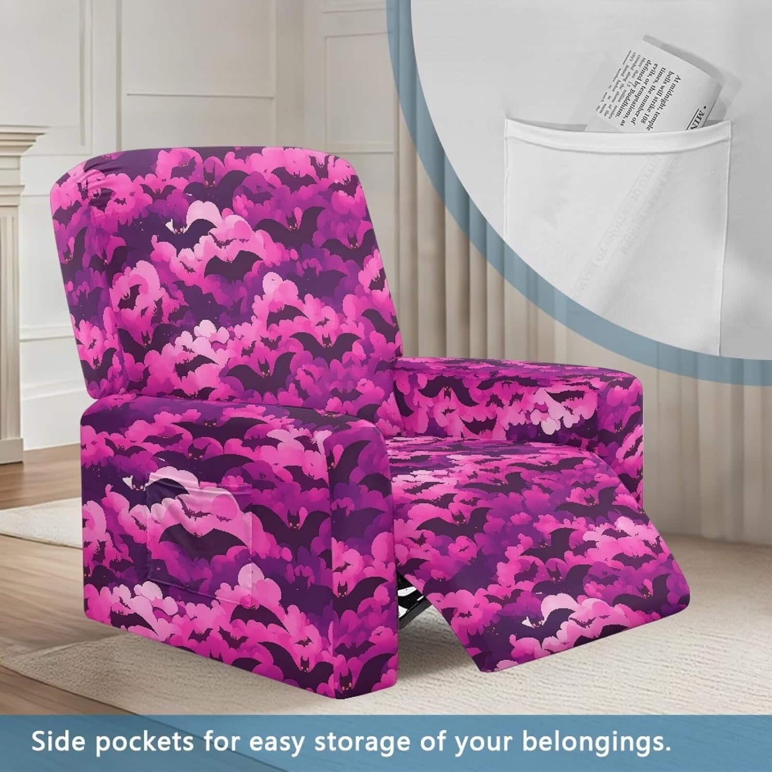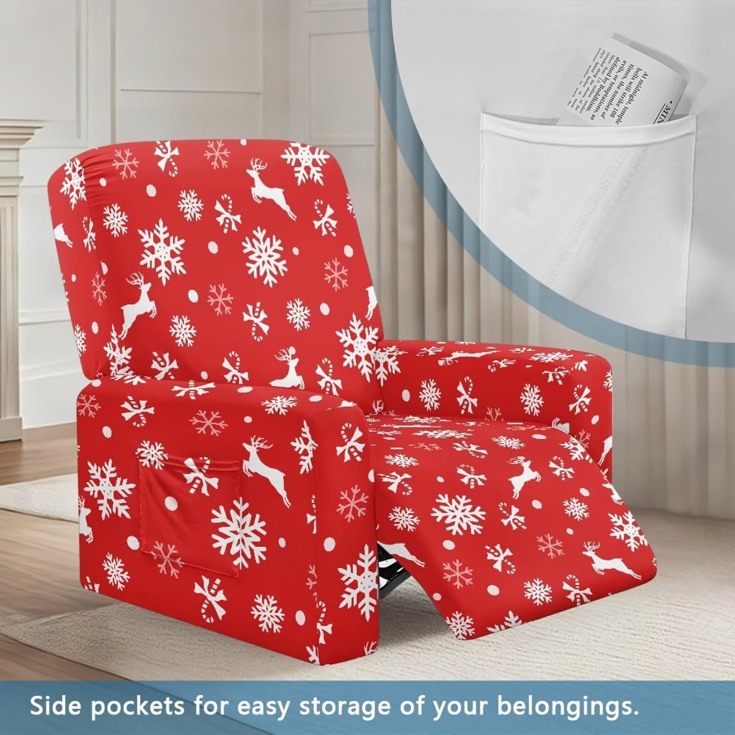 Voxugoniy Stretch Recliner Chair Covers with Pocket Chair Covers for Reclining Chairs Furniture Protector Recliners Couch Cover Soft Recliners Covers with Elastic Bottom Material: Give your worn-out recliner a stylish makeover with premium Stretch Recliner Chair Covers! Crafted from polyester and spandex, Recliner Chair Covers hug every curve of your chair for a custom-fit look. Whether protecting against coffee spills, pet hair, or sun damage, its thick yet breathable fabric offers year-round comfort. The smart design includes reinforced seams, non-slip bottom, and precise openings for armrests, headrests, and reclining mechanisms – ensuring full functionality without removal. Recliners Covers blends with any decor while saving you costly reupholstery. Simply toss it in the washing machine for effortless maintenance. Revive your living room today! Pockets Design:Hide remotes/treats in stealth side compartments. Easy Installation & Clean:One piece design make the installation easier by simply draping, connecting back straps and tucking seams. Then the recliner chair covers will save your furniture from Puppy slobber and bite marks, mischief and spills. Easy removal of cats dogs fur, liquids. Suitable for all recliners/sofas: electric recliners with footstools, leather/velvet/fabric recliners, oversized armchairs. Ideal Gifts: There are Santa Claus for Christmas, cute ghosts for Halloween, and maple leaves for Thanksgiving to create a festive atmosphere. Choose from a variety of patterns such as bohemian florals, animal prints, marbles, and other beautiful prints. They are great gifts forparents, wives, friend, elders, and friends on Halloween, Thanksgiving, Christmas.