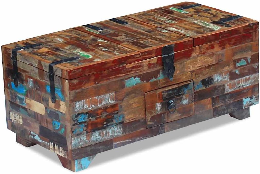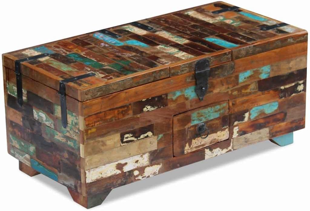 Elevate your living space with this unique Solid Reclaimed Wood Coffee Table Chest. Meticulously handmade from recycled timbers such as teak and mango wood sourced from old structures, each table boasts a one-of-a-kind character with visible grain and color variations. As shown in the picture. This multifunctional piece is designed for both style and practicality. The innovative lift-up tabletop opens to reveal three spacious storage compartments, while an additional drawer offers further organization. It seamlessly serves as a living room coffee table, a rustic chest, a functional side table, or a charming drawer table. Keep your magazines, remote controls, books, and other items neatly stowed yet easily accessible. The vintage industrial coffee table chest features a robust and stable build, finished with polish, paint, and lacquer for durability. Its distinctive antique aesthetic, marked by natural signs of wear, brings a touch of history and artisanal warmth to your home. Perfect as a statement centerpiece, it complements a wide range of decor styles from modern farmhouse to traditional. Important Note: Due to the nature of reclaimed wood, colors and grain patterns may vary from piece to piece, ensuring the exclusivity of your product. The lock for the compartment is not included. Dimensions: 31.5 inches in length, 15.7 inches in width, and 13.8 inches in height. Discover the perfect blend of rustic charm and functional design. This handmade reclaimed wood storage table is not just furniture; it's a conversation piece that adds personality and organized elegance to your daily life.