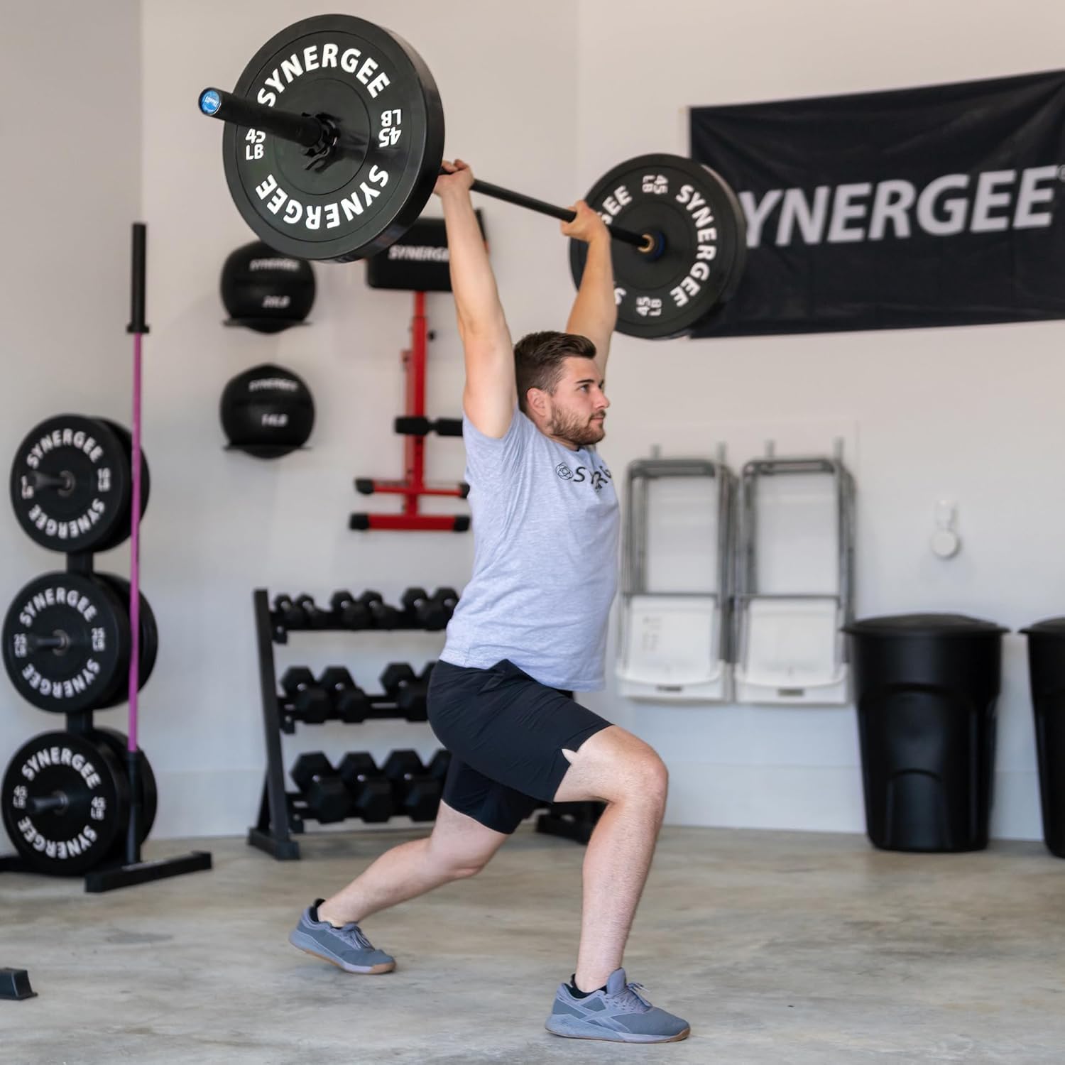 Our Synergee Bumper plates are durable, aesthetically pleasing, and they come with an honest price tag. We don’t charge you for shipping; we only charge for a low-bounce, high-quality rubber polymer bumper plates. When hitting your 1RM, the last thing that should be on your mind is, “Can I drop this if I need to bail?!”. These bumper plates are built to withstand drops - even from overhead - so you can prioritize your safety while challenging PRs. They are durable and dependable, and they save your platform, floors/mats, and bars from damage, too! With a collar opening of 2”, they can be loaded onto any standard barbell; and with their thin profile, you can load 5 x 45 lbs and 2 x 15 lbs plates on a standard bar sleeve (510 lbs total). Each plate has white letter markings that are highly visible, even from a distance. These plates are a must have for any workout that uses Olympic lifts, as well as home gyms, and school weight rooms.